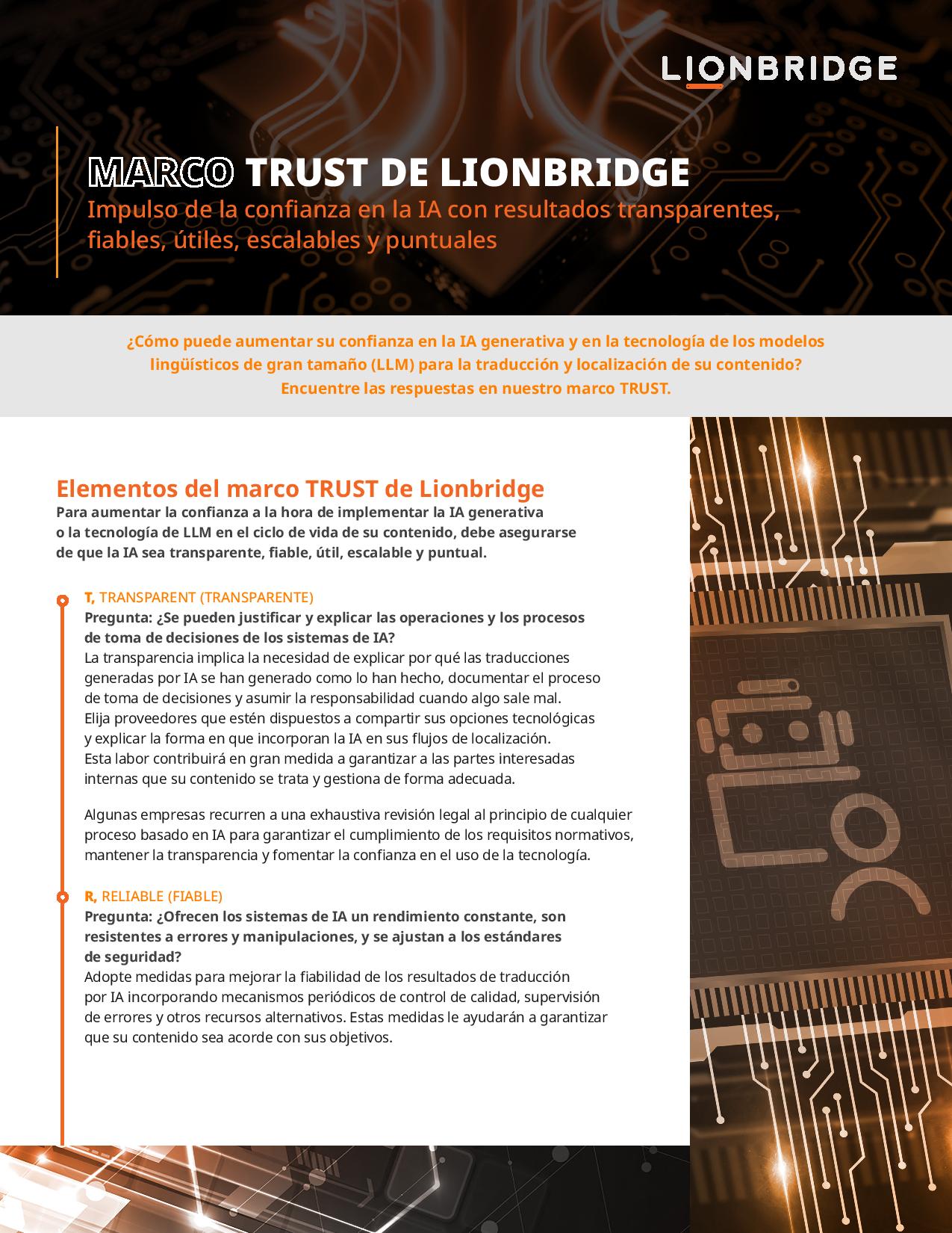 Afortunadamente, es posible emplear estrategias específicas para fomentar la confianza en la IA, incluida la confianza en la tecnología y en el socio que la gestiona. Hemos creado una práctica hoja de referencia en la que se detalla el marco TRUST de Lionbridge que le servirá como guía. El marco, organizado a través del acrónimo TRUST, comprende cinco medidas relacionadas con la confianza para garantizar que la IA sea: