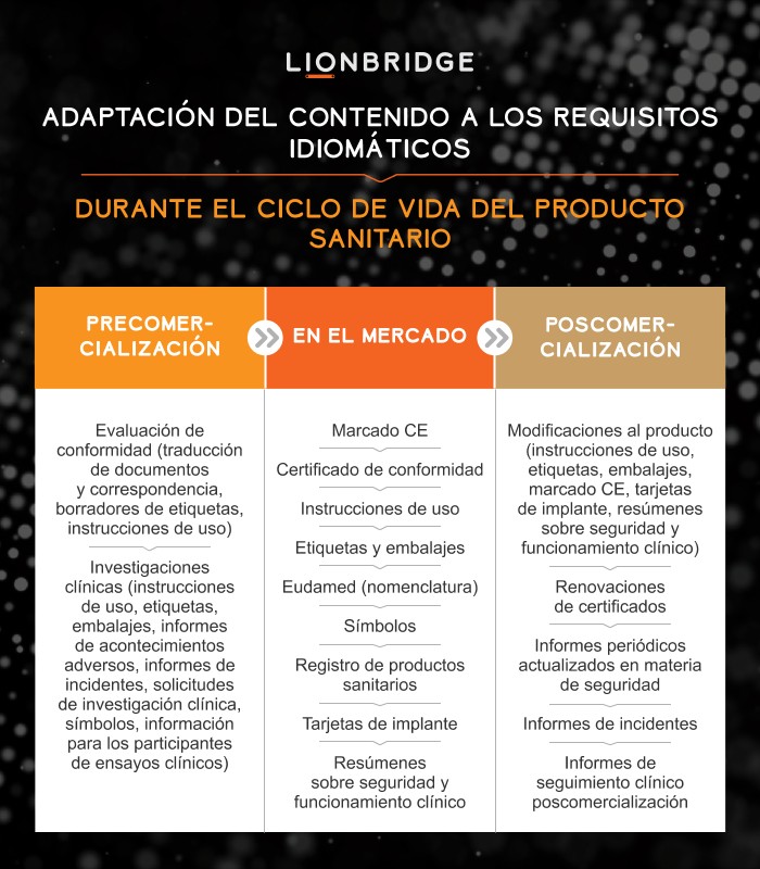 Dado que las traducciones seguirán un aumento de la documentación exigida para el producto, en especial para los de alto riesgo, y dependiendo del usuario del contenido, la dificultad de las traducciones puede variar en el catálogo de productos. En Lionbridge recomendamos un diálogo con los clientes que ya están en la fase previa a la aprobación del producto sanitario, a fin de evitar demoras e incoherencias y de impulsar eficiencias a través del ciclo de vida del producto.