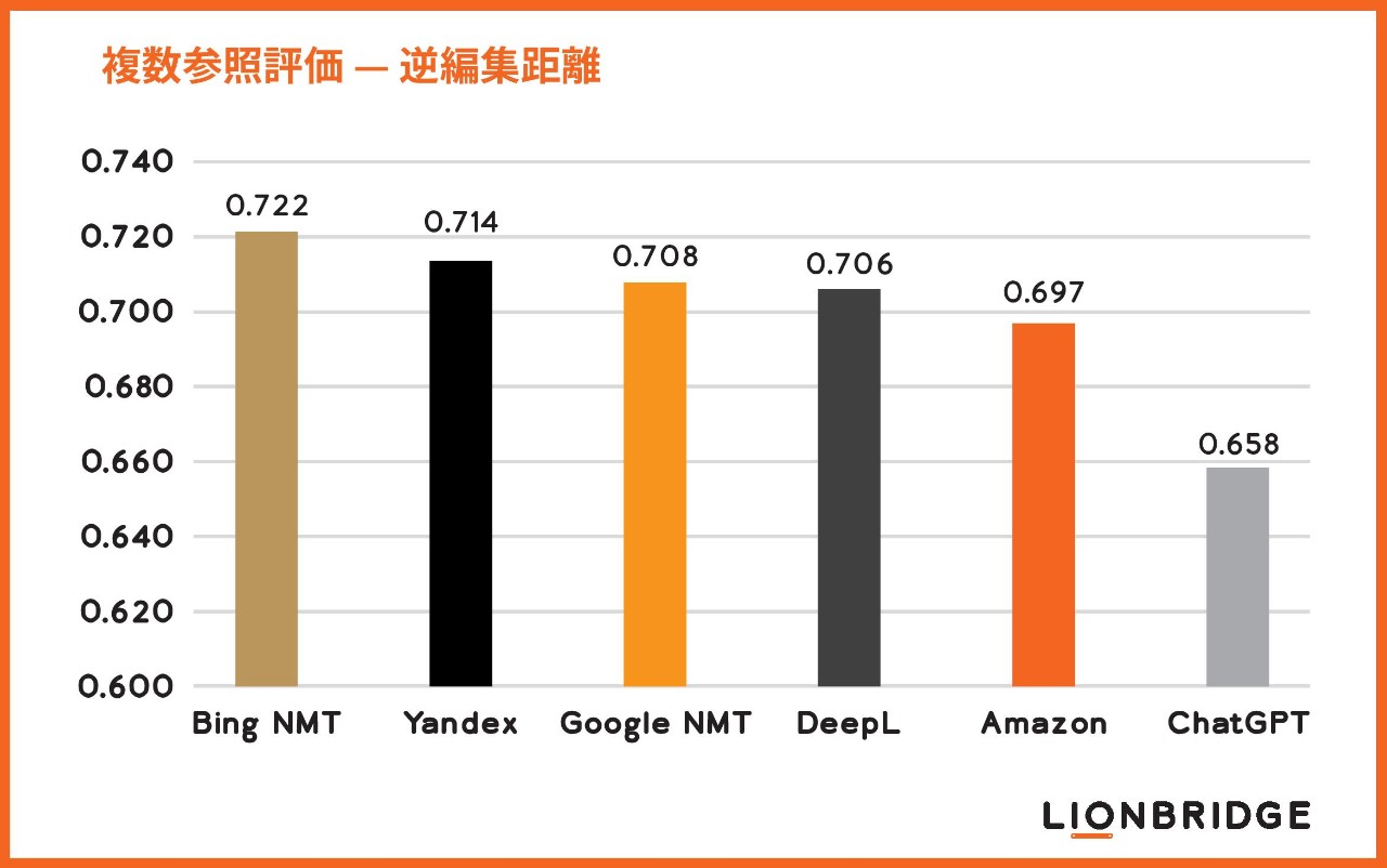図 1. 英語からスペイン語に翻訳する言語ペアの複数の参照訳を使用した逆編集距離に基づく、ChatGPT と主要機械翻訳エンジンによる自動翻訳品質の比較。