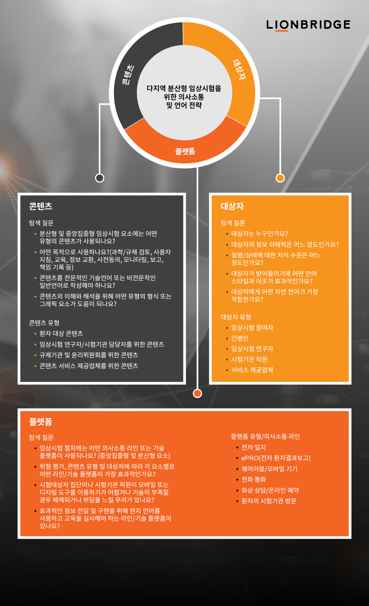 분산형 임상시험을 위한 언어 전략 수립에 도움이 필요하신가요? 임상연구 참여자 모집 자료와 같은 정보들을 보다 효과적인 다국어 소통 방식으로 다양한 대상자와 공유하는 방법을 찾고 계신가요? 기술력과 임상시험 번역 전문성을 갖추고 숙련된 프로젝트 관리팀을 두고 있는 라이온브리지는 고객이 필요로 하는 임상시험 번역 서비스를 제공합니다. 지금 바로 문의하여 라이온브리지 임상시험 번역 서비스에 대해 자세히 알아보세요.