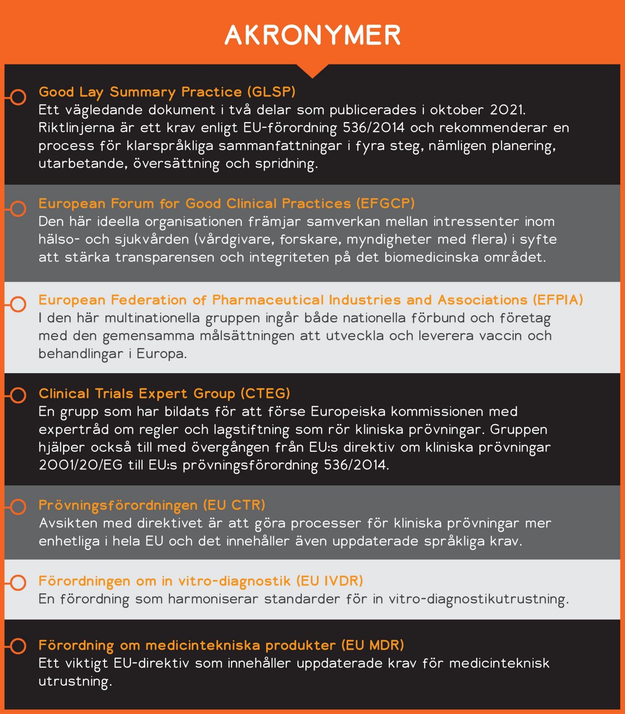 Gruppen började med att samla in och diskutera befintlig sakkunskap om klarspråkliga sammanfattningar. Sedan utvecklade vi gemensamt de bäst lämpade metoderna som kommer att presenteras i en snabbguide och en handbok som förenklar det som kommer att bli ett lagstadgat krav när Prövningsförordningen börjar gälla den 31 januari 2022. I samarbete med expertgruppen för kliniska prövningar (CTEG), som tillhör den Europeiska kommissionens generaldirektorat för folkhälsa och livsmedelssäkerhet, har dessa rekommendationer nu blivit en del av det regelverk för kliniska prövningar som presenteras i volym 10 av EudraLex.