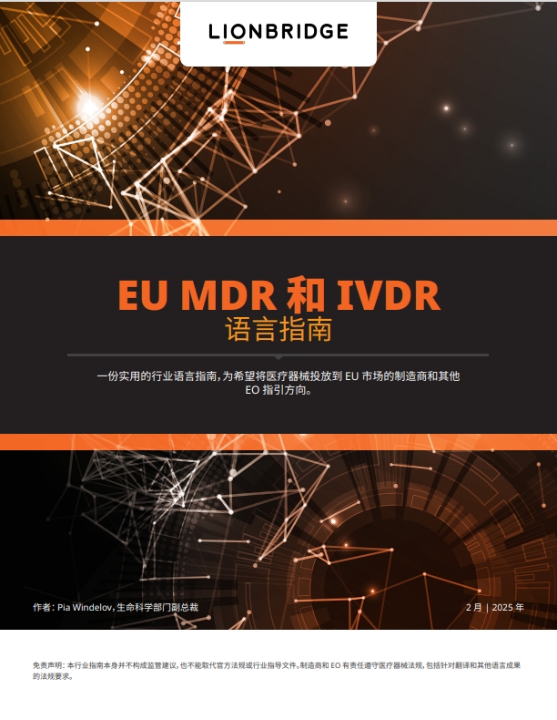 无论您是制造商还是其他经济运营商,您都将受益于这份有关监管类文件翻译的全面行业指导。您将获得对 MDR 和 IVDR 所有条款的系统性综述,其中重点关注语言和语言成效。我们还提供有关如何在生命周期语言策略下从 AI 和大型语言模型中受益的指导。