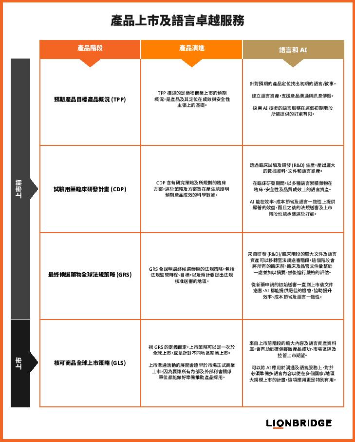 建議考慮使用 AI,以便在執行上市計畫時增進語言方面的成果。只要能妥善控管風險,並以適當的語言工作流程建立上市溝通所要使用的內容,就能安全又有效益地使用這項技術。對於全球上市方案來說,大型語言模型會很有用處,尤其是方案有善用來自上市前階段的語言資產的話。這麼做不但可以最佳化上市期間的語言服務執行,更可在產品定位上展現語言一致性。隨著試驗藥物研發階段的進行,以及臨床資料、文件與標示主張的研擬,藥物所欲傳遞的訊息及其商業定位也會逐漸成形。在上市前階段建立生命週期 AI 語言策略,來自研發 (R&D) 階段的語言資產也就能轉移至上市階段使用,這麼做也有助於提高效率及節省成本。更重要的是,製藥企業的結構經常是各自為政,缺乏集中管理,而且從上市前階段進展至上市階段時,語言資產也往往沒有一併轉移,這些都會造成產品訊息不一致,語言策略的建立便有助解決這個問題。除了節省成本外,應用 AI 還能帶來以下的重要機會: