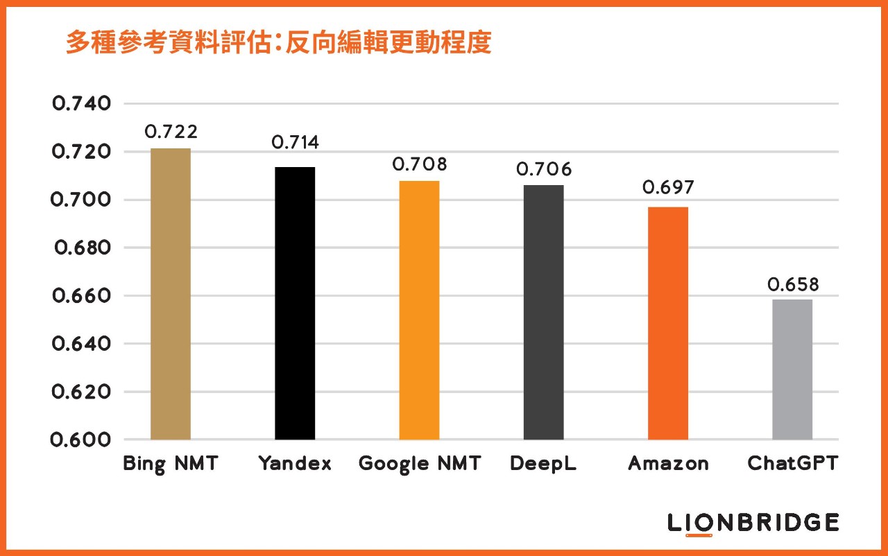 圖 1. 根據英翻西這個語言組合的多個參考翻譯計算反向編輯距離,比較 ChatGPT 與主流機器翻譯引擎的自動翻譯品質。